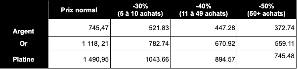 Plus élevé sera le nombre d’inscrits, plus forte sera la réduction, quelque soit la bibliothèque choisie (parmi or, argent et platine). Par exemple, pour 11 commandes au total, comprenant 5 commandes argent, 4 commandes or et 2 commandes platine, le prix sera déjà abaissé de 40% pour toutes les commandes.