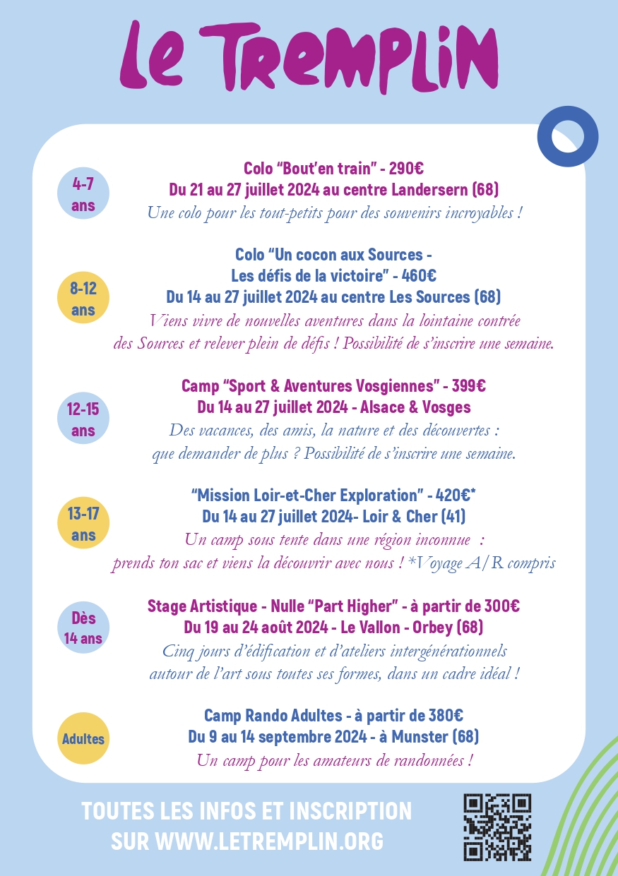 Vous pouvez trouvez ci-dessous les activités du Tremplin pour l’été 2024 ! Petits et grands peuvent choisir dès maintenant un des camps qui auront lieu tout au long de l’été.