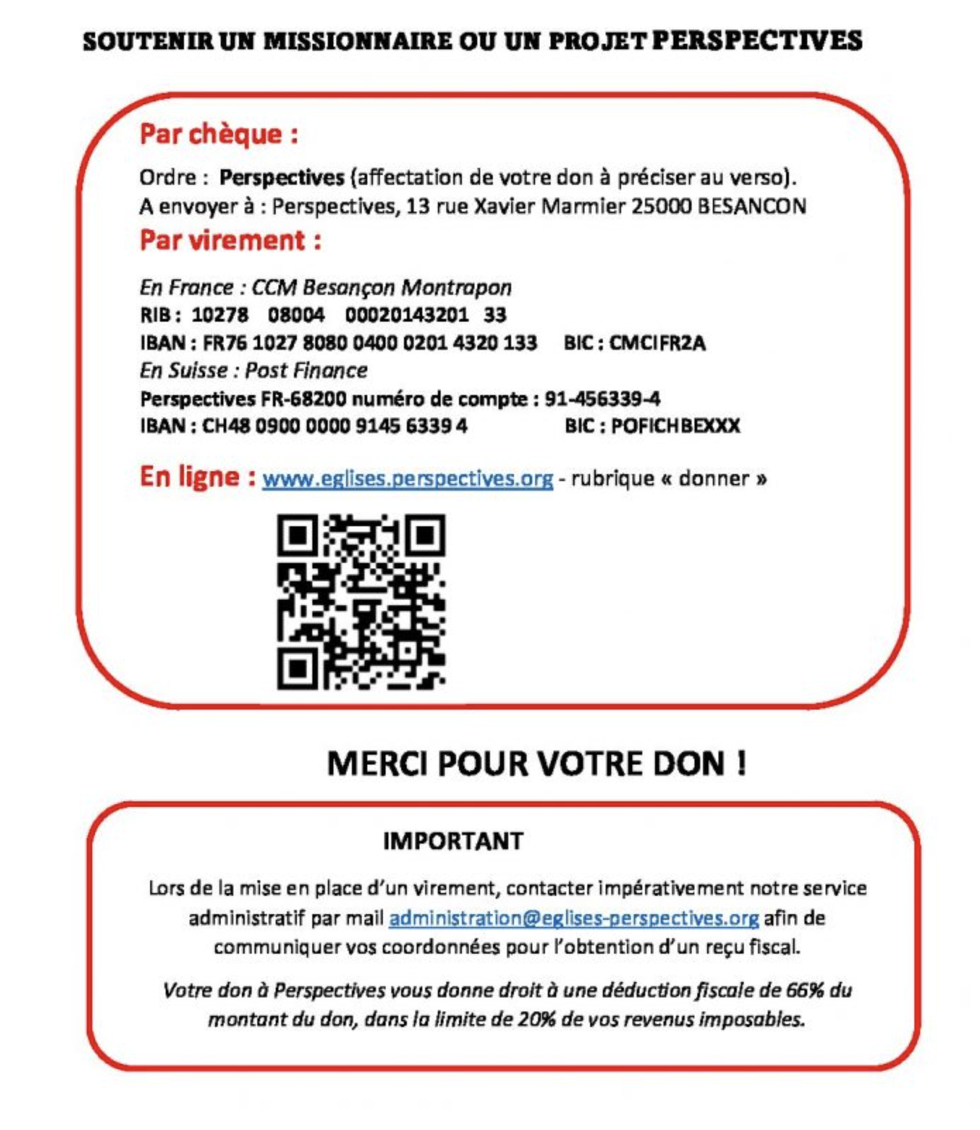 Pour faire un don : de France : www.payasso.fr/perspectives/dons , ou de l’étranger : www.francemission.org/donate (écrire dans les deux cas « Christian et Kathryn Panès » dans la case « affectation de mon don »)