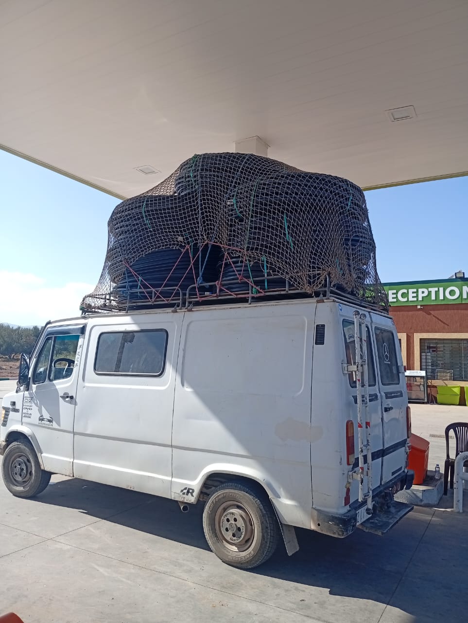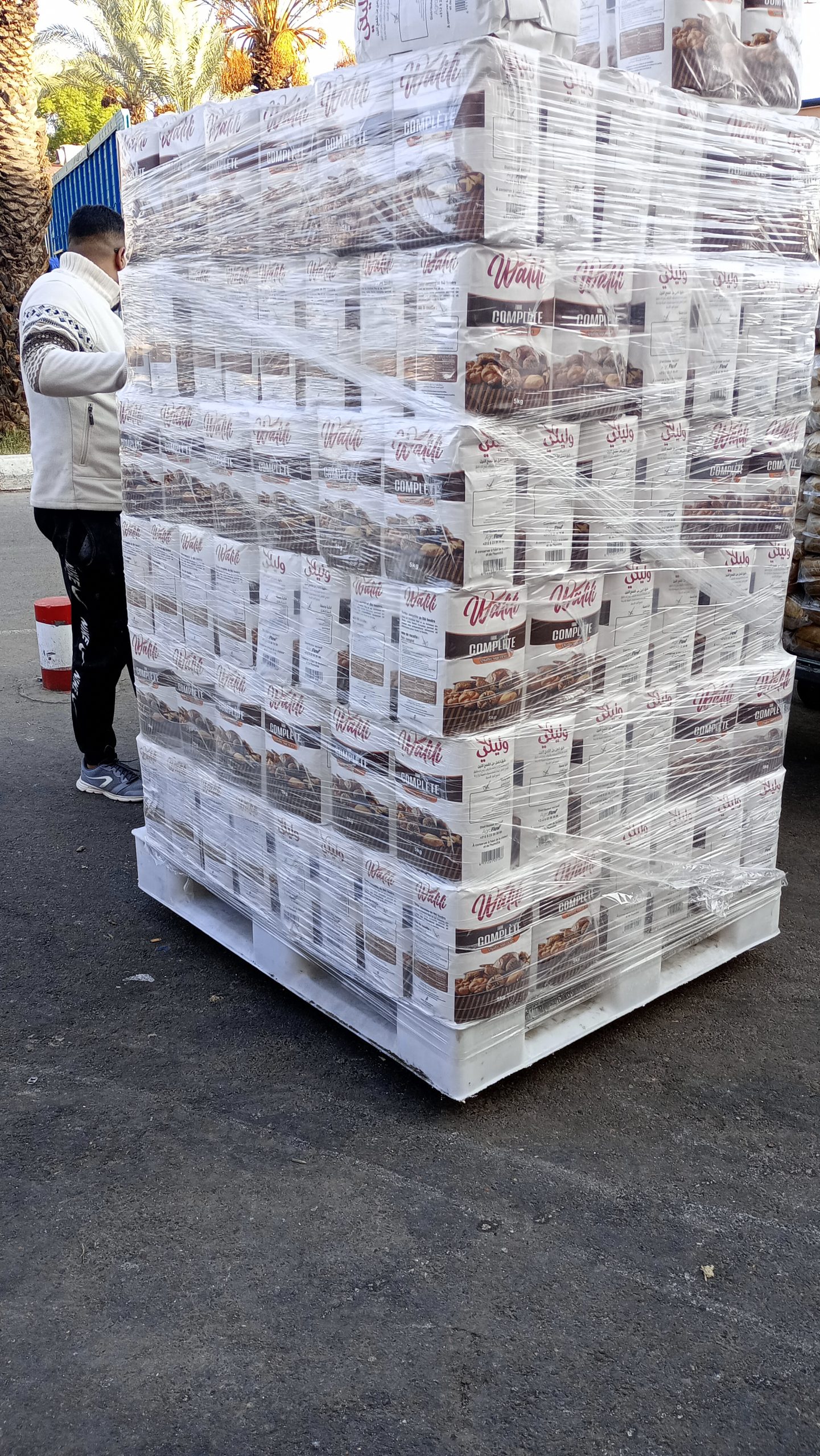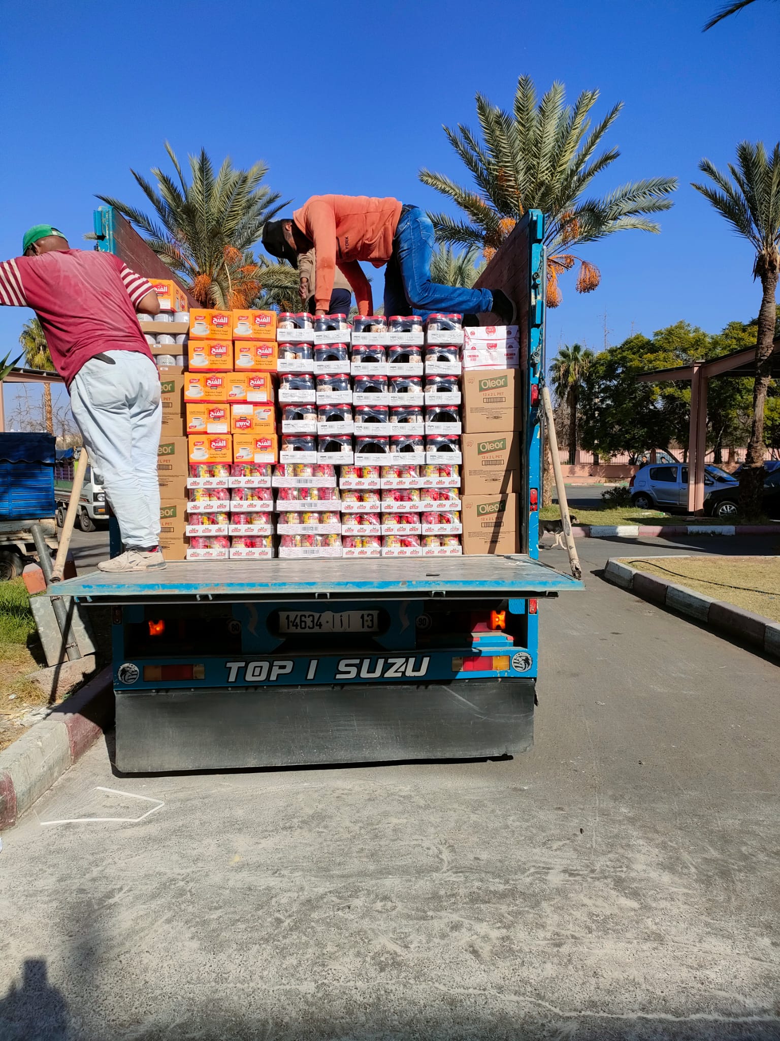 Première grande joie pour nous : aider à charger, une matinée durant, un gros camion et 3 camionnettes de denrées alimentaires. La charge utile du camion, 12 tonnes, a été très largement dépassée, avec farine (le pain, beaucoup consommé et toujours excellent, sert de « fourchette » pour manger tajines et autres plats marocains), pois chiches, lentilles, couscous, sucre (beaucoup pour le thé!), thé, café, conserves de tomates, pâtes, savons et produits de nettoyage, etc…