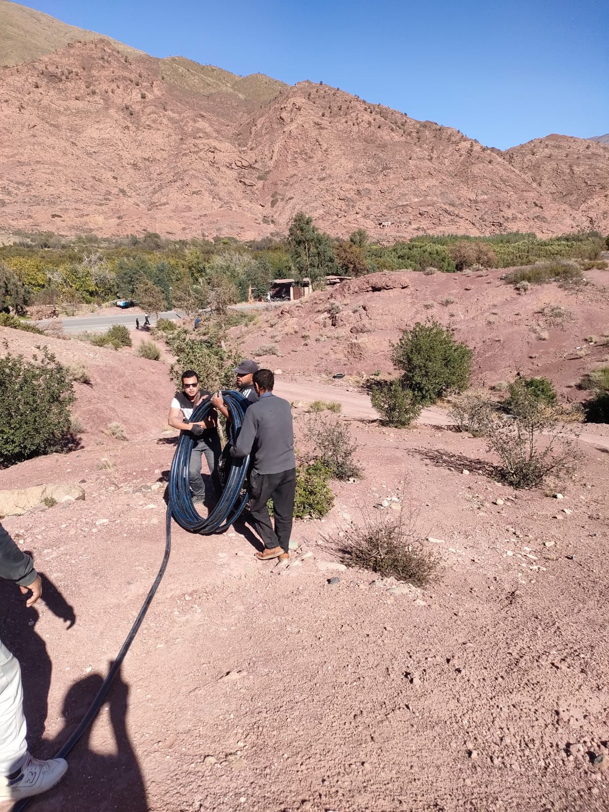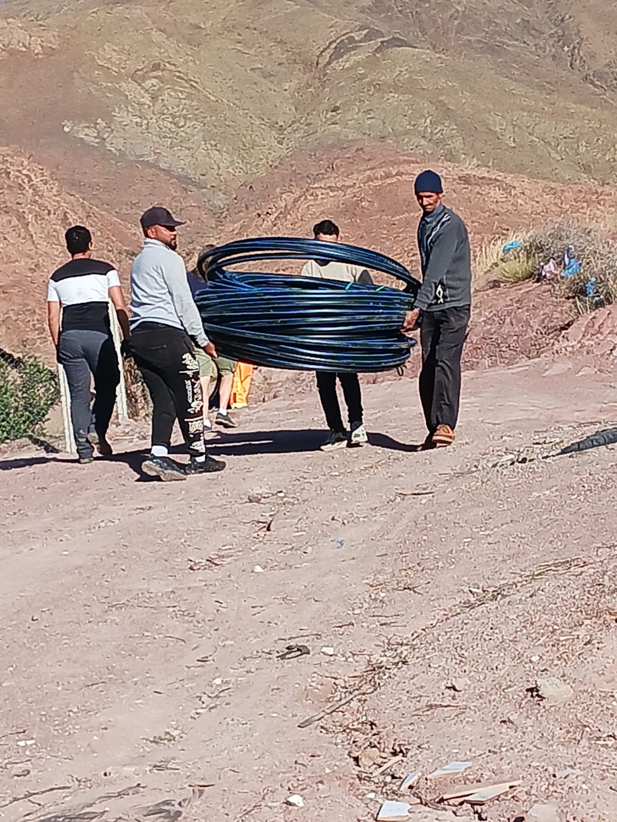 Nous avons aussi pu mettre en place, à travers les collines et au milieu des villages 1800 mètres de tuyaux, sur les 2600 mètres achetés et effectuer les raccords nécessaires, à partir d’un château d’eau trônant au sommet d’une montagne. Les « plombiers » locaux, très reconnaissants pour cette livraison, se sont engagés à terminer le travail. Très intéressé par les méthodes employées, j’ai été déçu, en tant qu’ancien plombier, de constater qu’il n’y avait aucun outil pour ce travail, à part un très vieux couteau de cuisine !